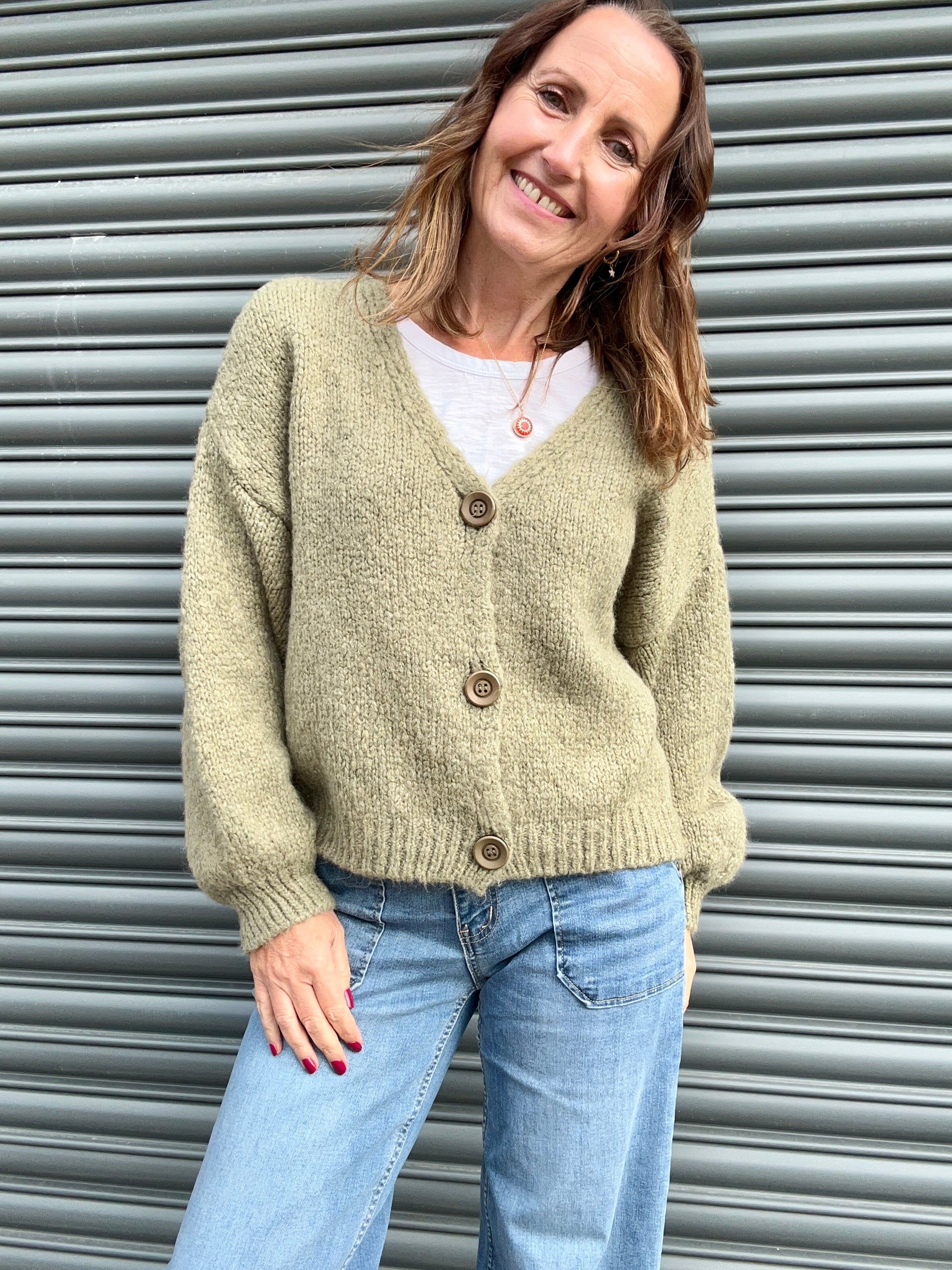 Simple and plain from the front - a soft and cosy cardigan with chunky buttons - with a fun smiley face design on the back. Khaki green which looks amazing with a fresh white tee and jeans.
