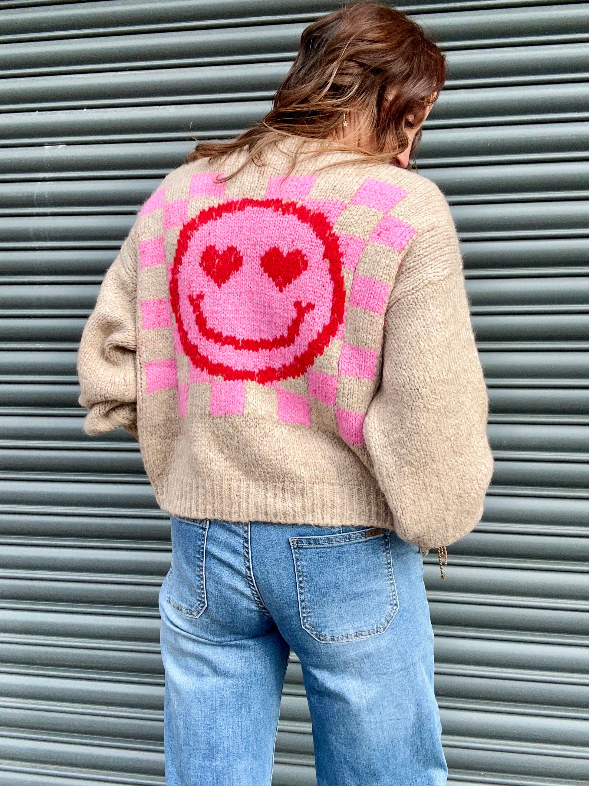 Simple and plain from the front - a soft and cosy cardigan with chunky buttons - with a fun smiley face design on the back. Soft oatmeal which looks amazing with a fresh white tee and jeans.