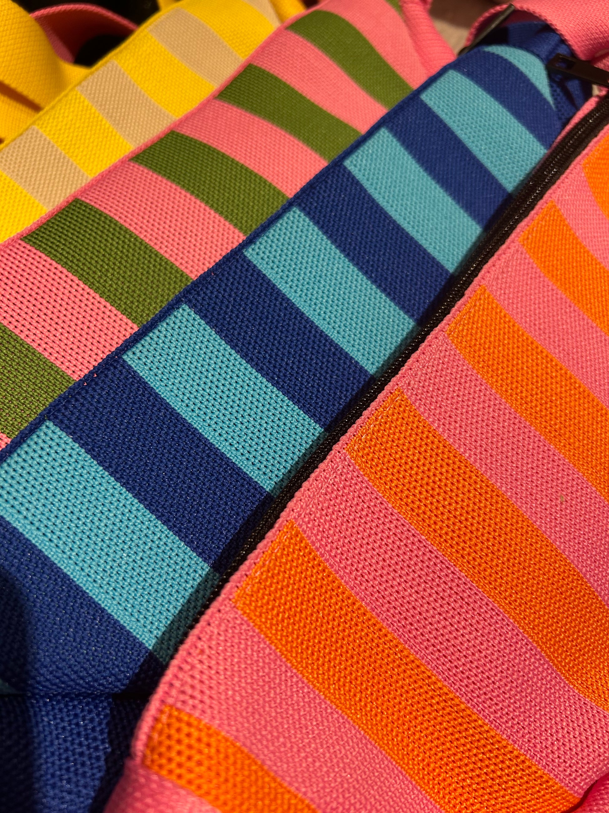 Fun, bold stripes are the order of the day after a grey January. The Kanga striped pouch bag delivers punchy colour and practical style.