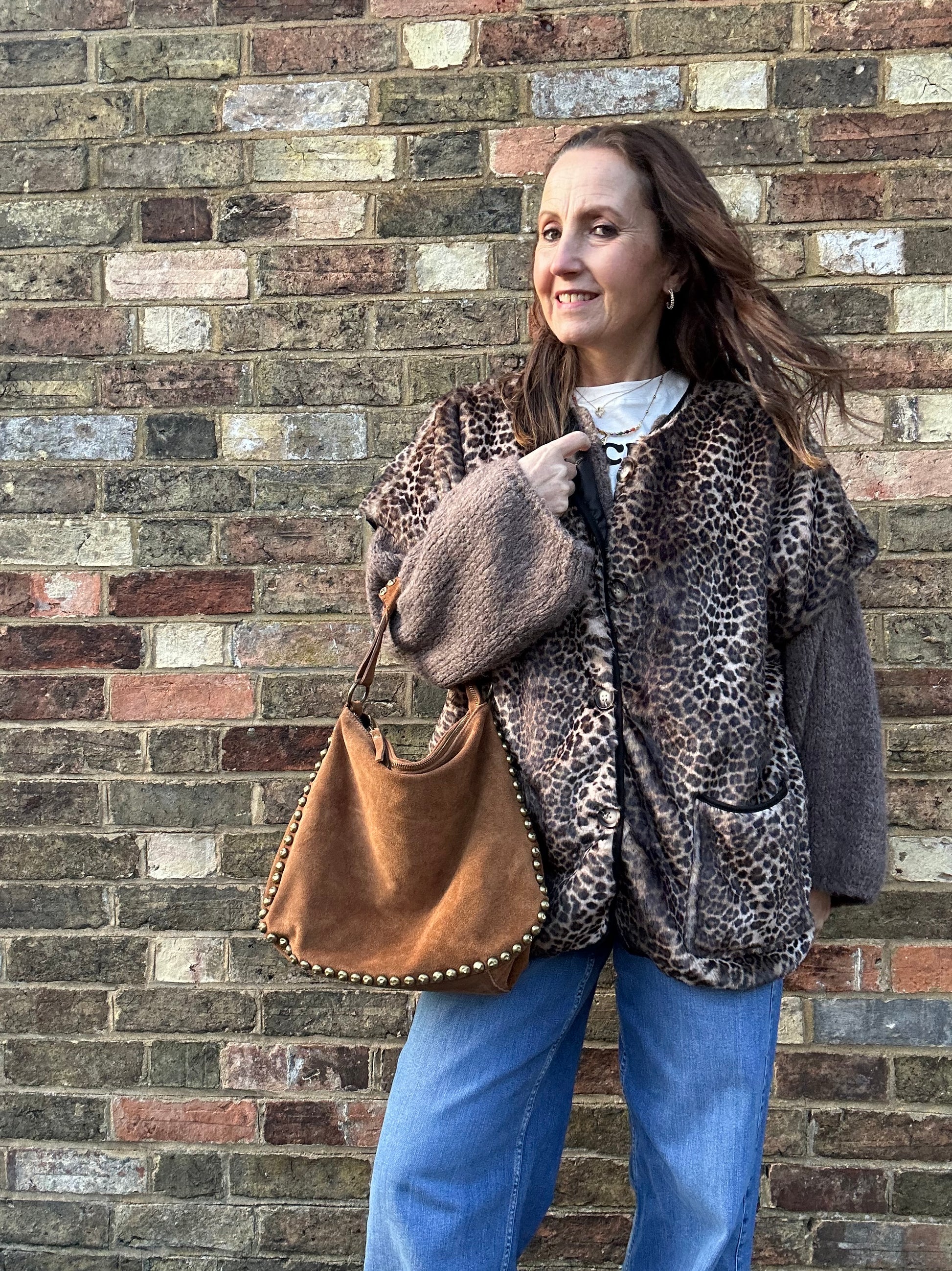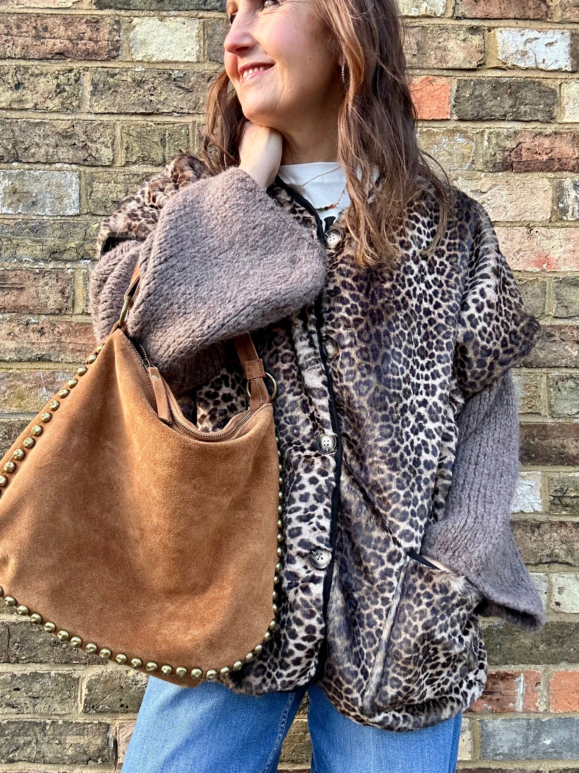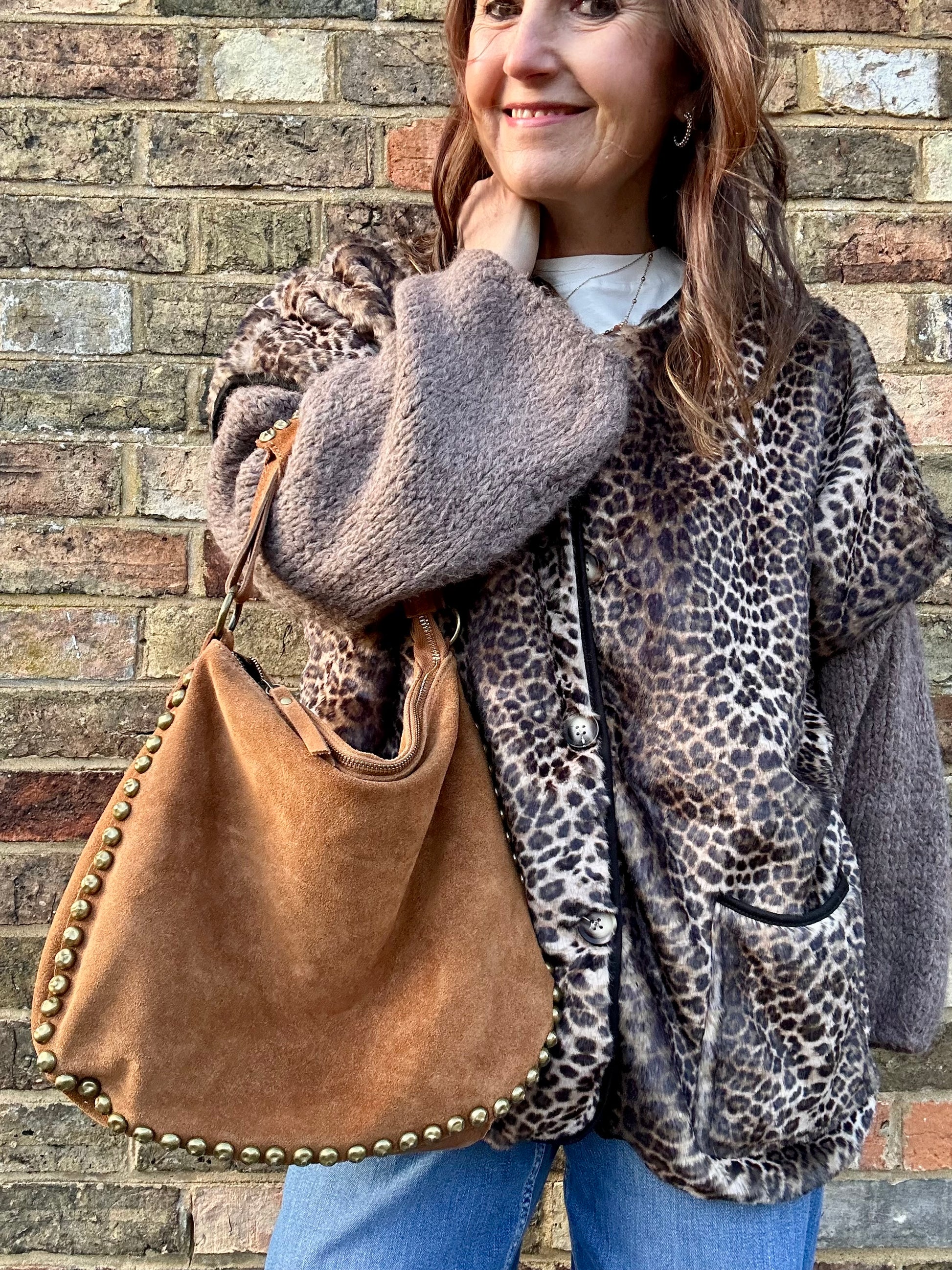 The Nova bag in studded suede leather, with an antique bronze finish, is made in Italy.
