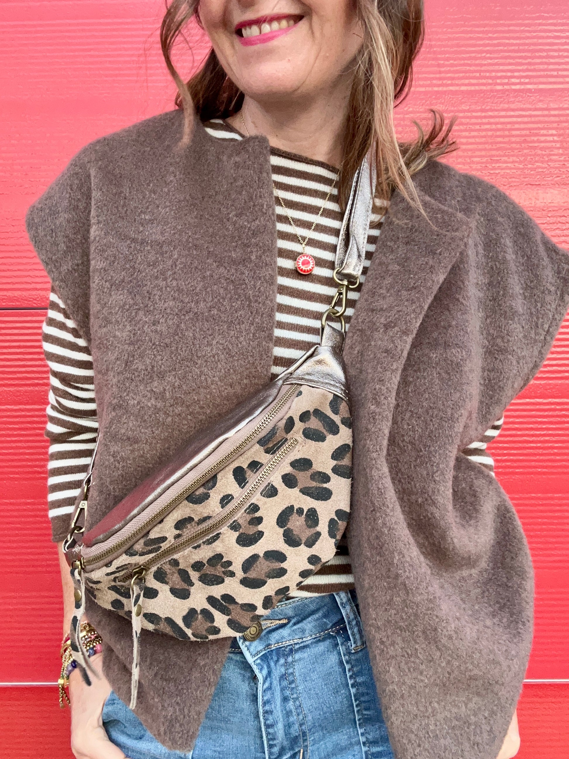 The coolest metallic and leopard bum bag - to add a metallic shimmer and cool leopard touch to any outfit. Soft bronze metallic leather with leopard patterned suede.