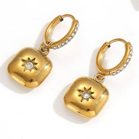 Delicate square charms with cubic zirconia gem on a sparkly hoop earring.