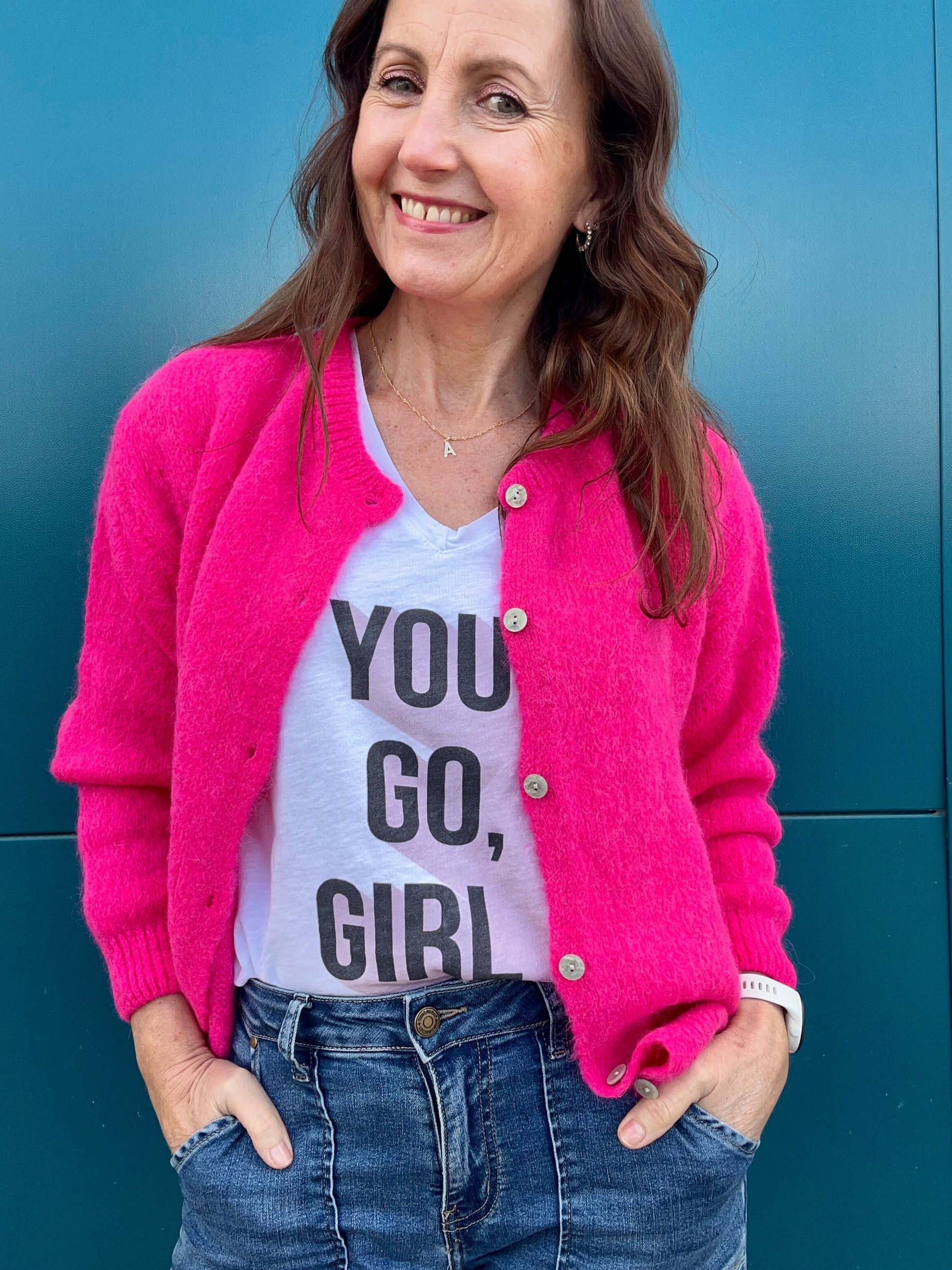 A fresh white tee for the new season - for the Girls on a mission. Soft pink with black lettering saying You Go Girl. A lovely new addition which looks great on its own or under one of our Juno cardigans.